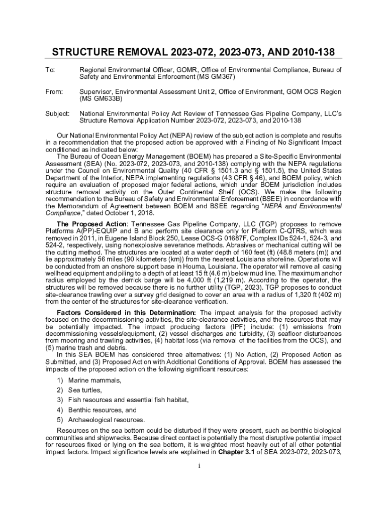 STRUCTURE REMOVAL 2023072, 2023073, AND 2010138 To:Regional Environmental Officer, GOER, Office of Environmental Compliance, Bureau of Safety and Environmental Enforcement (MS GM367)From:Supervisor,
