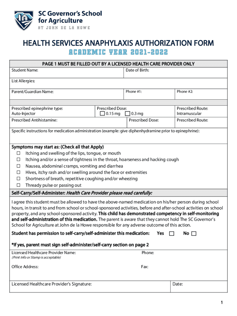 HEALTH SERVICES ANAPHYLAXIS AUTHORIZATION FORM ACADEMIC YEAR 20212022 PAGE 1 MUST BE FILLED OUT BY A LICENSED HEALTH CARE PROVIDER ONLY Student Name:Date of Birth:List Allergies: Parent/Guardian Name:Prescribed