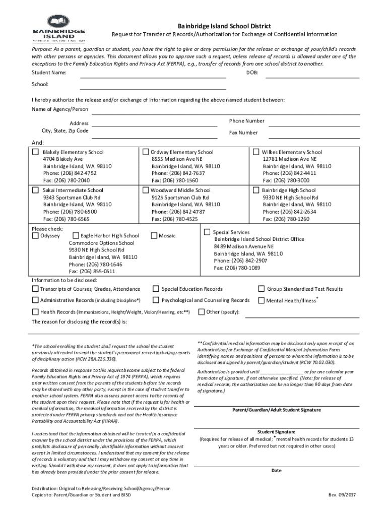 RequestforTransferofRecords/AuthorizationforExchangeofConfidentialInformationPurpose:Apparent, guardianorstudent, youhavetherighttogiveordenypermissionforthereleaseorexchangeofyour/childsrecords