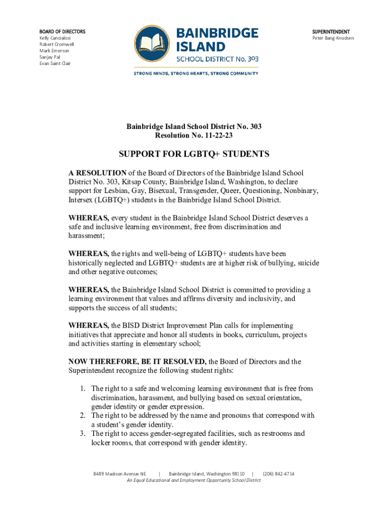 BOARD OF DIRECTORS Kelly Cancialosi Robert Cromwell Mark Emerson Sanjay Pal Evan Saint ClairSUPERINTENDENT Peter BangKnudsenBainbridge Island School District No. 303 Resolution No. 112223SUPPORT FOR