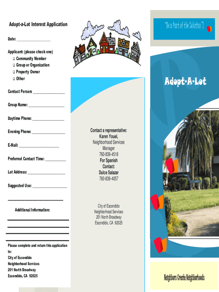 To fill out the Adopt-a-Lot program application, applicants should provide their contact information, details about the lot they wish to adopt, a description of their intended activities, and submit the form to the Baltimore City Department either online or in person.