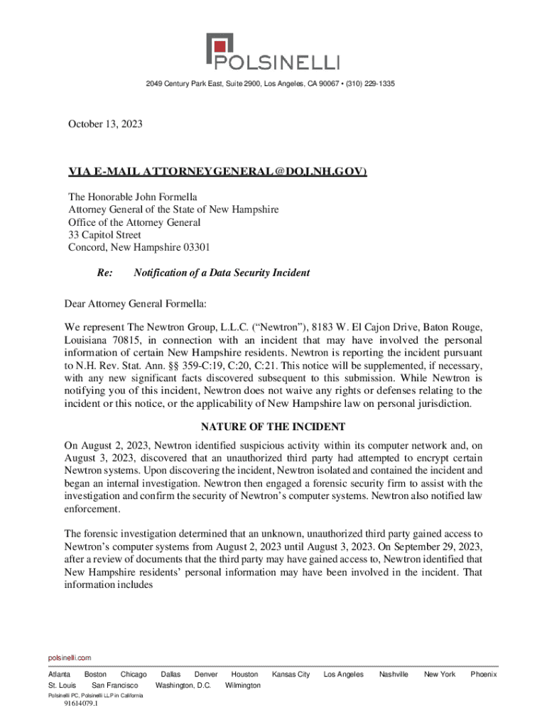 2049 Century Park East, Suite 2900, Los Angeles, CA 90067 (310) 2291335October 13, 2023VIA EMAIL ATTORNEYGENERAL@DOJ.NH.GOV)