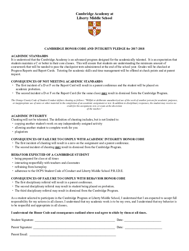 Liberty Middle SchoolCAMBRIDGE HONOR CODE AND INTEGRITY PLEDGE for 20172018