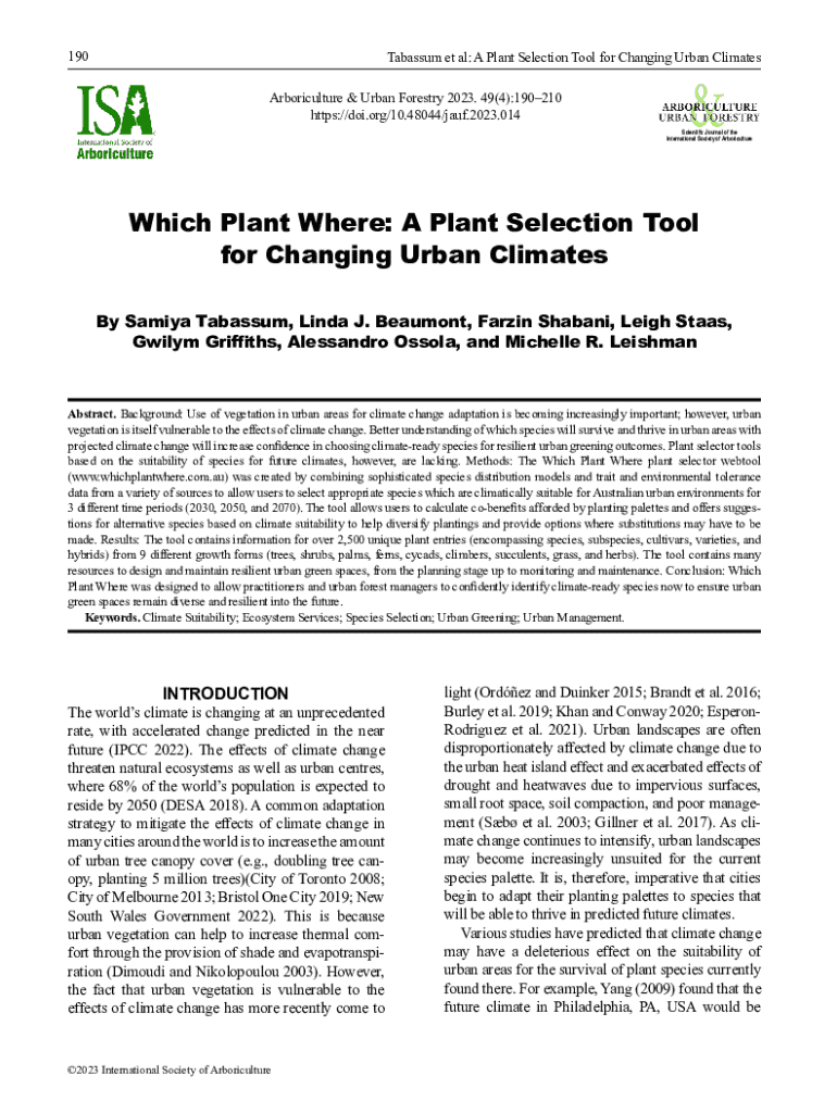 190Tabassum et al: A Plant Selection Tool for Changing Urban Climates Arboriculture & Urban Forestry 2023. 49(4):190210 https://doi.org/10.48044/jauf.2023.014 Scientific Journal of the International