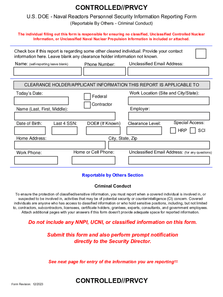 U.S. DOE Naval Reactors Personnel Security Information Reporting Form