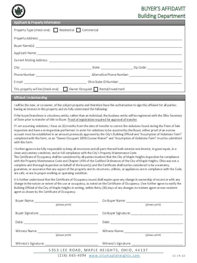 BUYERS AFFIDAVIT Building Department Applicant & Property Information Property Type (check one):ResidentialCommercialProperty Address: ___ Buyer Name(s): ___ Applicant Name: ___ Current Mailing Address: