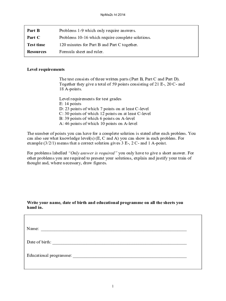 NpMa2c ht 2014Part Problems 19 which only require answers. Part Problems 1016 which require complete solutions. Test time120 minutes for Part B and Part C together. ResourcesFormula sheet and ruler.