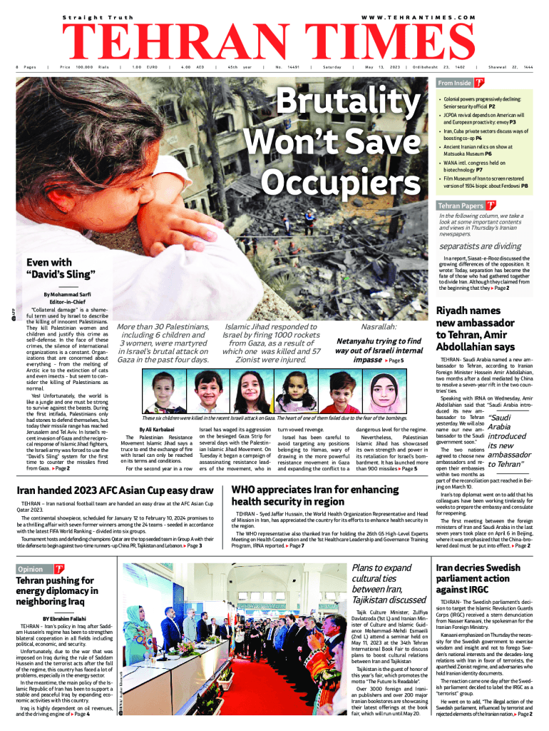 S t r an i g h t8Pages|Price100,000T r u t trials|W W W. T E H R A N T I M E S. C O M1.00EURO|4.00AED|45thyear|No.14491|Saturday|May13,2023|OrdibeheshtBrutality