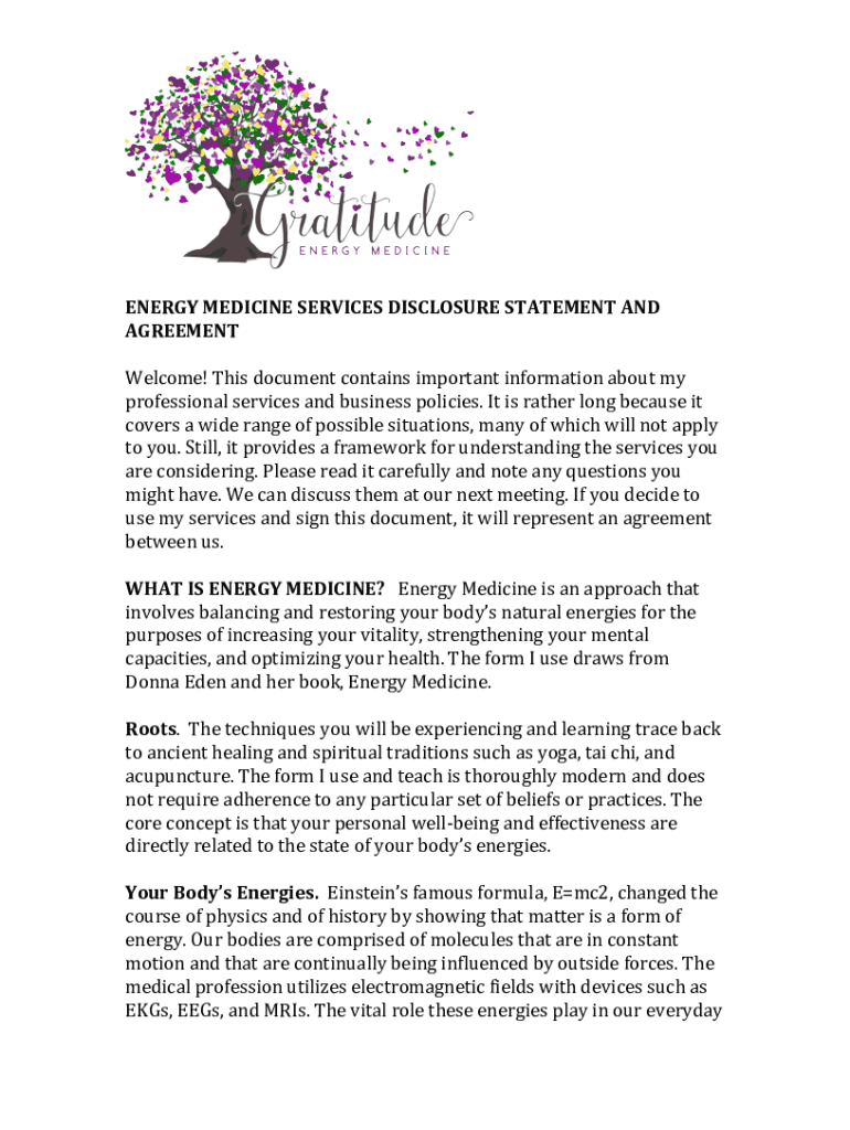 ENERGY MEDICINE SERVICES DISCLOSURE STATEMENT ANDAGREEMENTWelcome! This document contains important information about my professional services and business policies. It is rather long because it covers a wide range of possible situations, many of which will not apply
