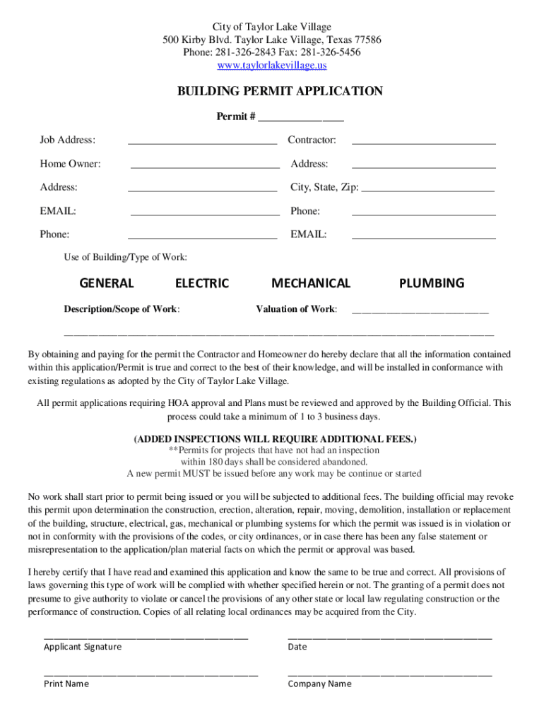 City of Taylor Lake Village 500 Kirby Blvd. Taylor Lake Village, Texas 77586 Phone: 2813262843 Fax: 2813265456 www.taylorlakevillage.usBUILDING PERMIT APPLICATION Permit # ___ Job Address:___Contractor:___homeowner:___Address:___Address:___City,