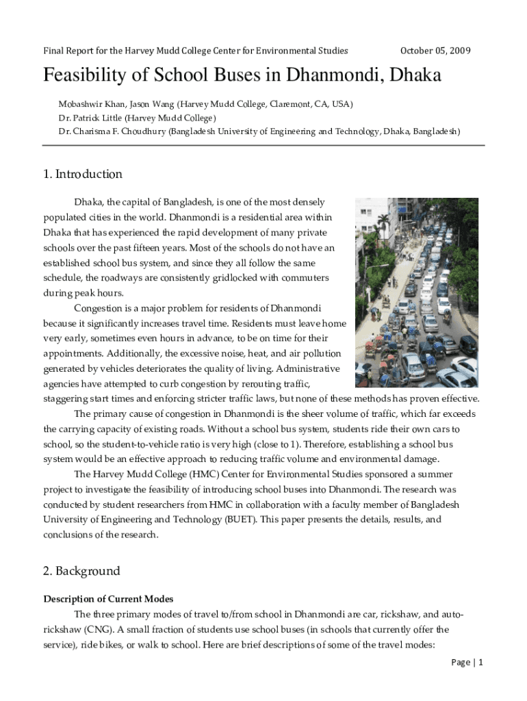 Final Report for the Harvey Mud College Center for Environmental Studies October 05, 2009Feasibility of School Buses in Diamond, Dhaka