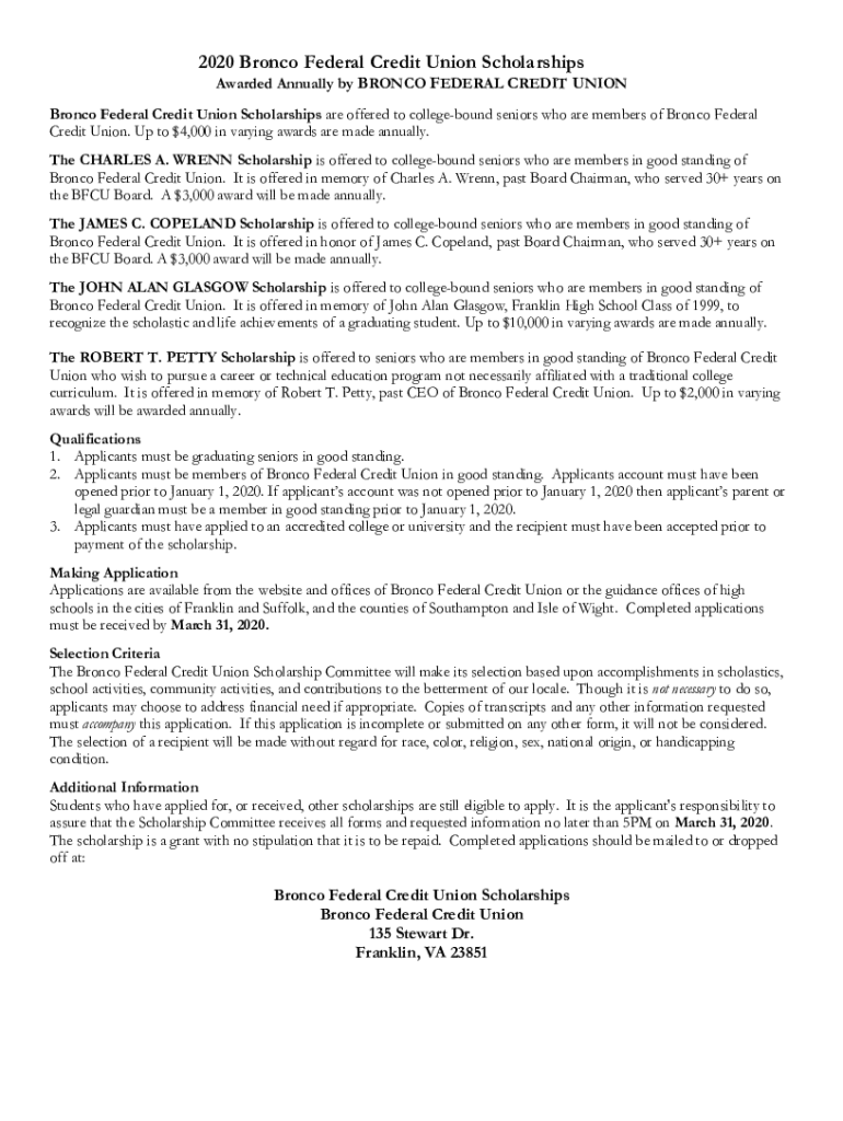 2020 Bronco Federal Credit Union ScholarshipsAwarded Annually by BRONCO FEDERAL CREDIT UNIONBronco Federal Credit Union Scholarships are offered to college bound seniors who are members of Bronco