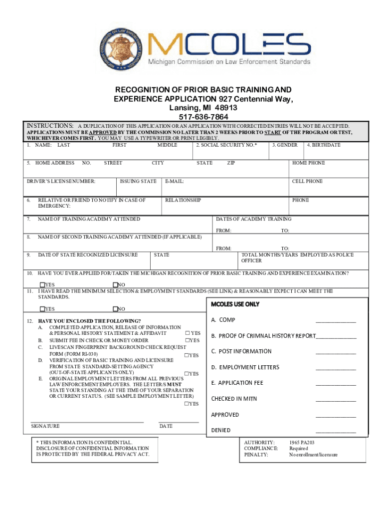 927 Centennial Way Lansing, MI 48913 Michigan.gov/MCOLES 5176367864 MSPMCOLES@michigan.govRecognition of Prior Basic Training and Experience Application PacketRevised 01/2024Application Requirements