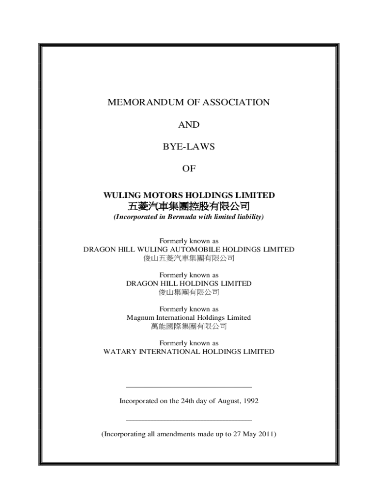 MEMORANDUM OF ASSOCIATION AND BYELAWS OF WULING MOTORS HOLDINGS LIMITED (Incorporated in Bermuda with limited liability)Formerly known as DRAGON HILL WULING AUTOMOBILE HOLDINGS LIMITED Formerly known