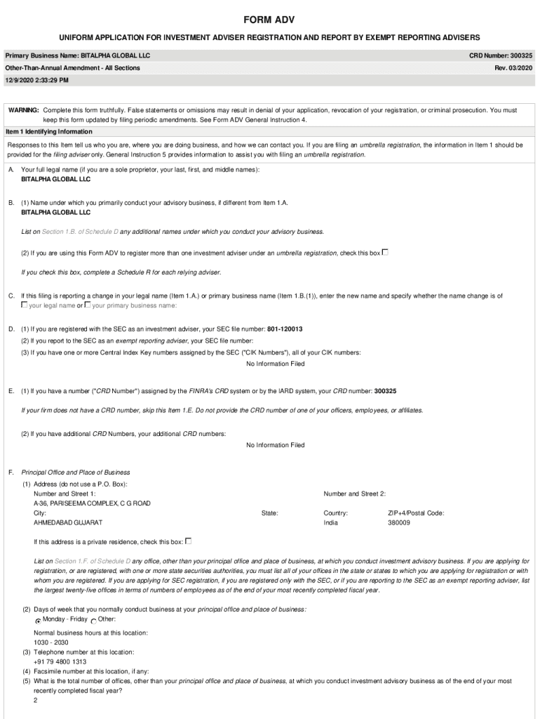FORM ADV UNIFORM APPLICATION FOR INVESTMENT ADVISER REGISTRATION AND REPORT BY EXEMPT REPORTING ADVISERS Primary Business Name: BITALPHA GLOBAL LLCCRD Number: 300325OtherThanAnnual Amendment All SectionsRev.