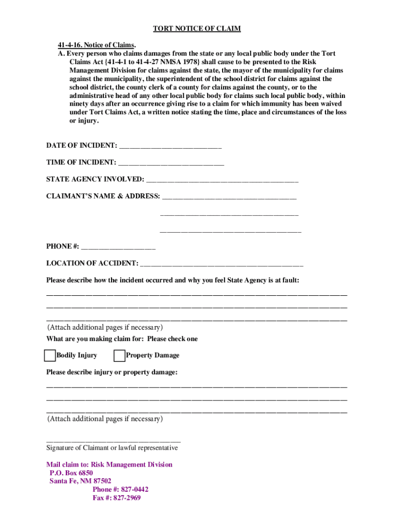 TORT NOTICE OF CLAIM 41416. Notice of Claims. A. Every person who claims damages from the state or any local public body under the Tort Claims Act 4141 to 41427 NASA 1978 shall cause to be presented