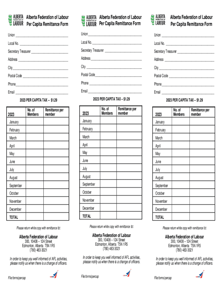 Get the free Alberta Federation of Labour Per Capita Remittance Form Alberta ...
