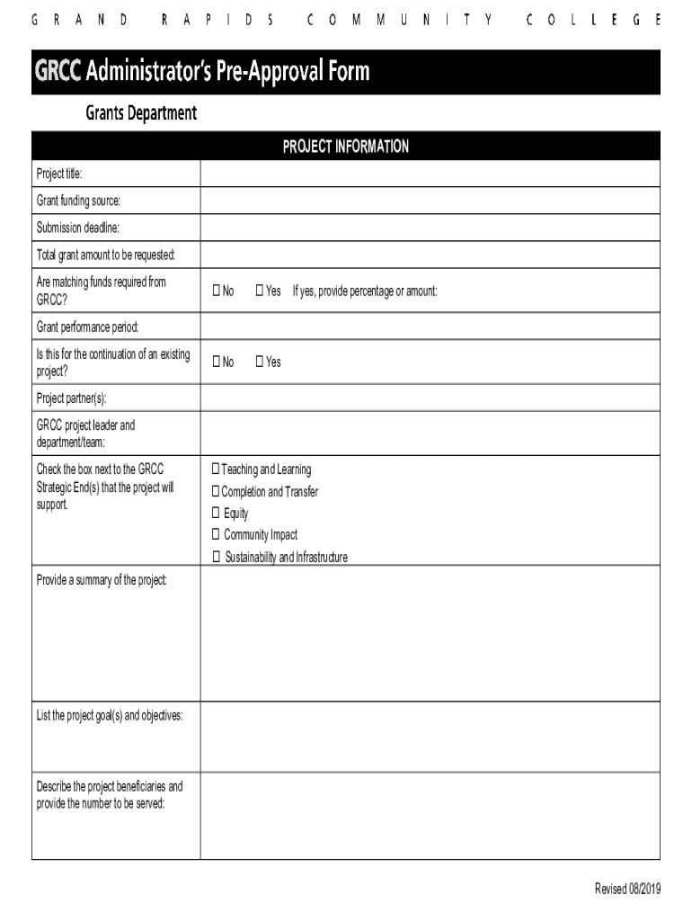 PROJECT INFORMATION Project title: Grant funding source: Submission deadline: Total grant amount to be requested: Are matching funds required from GRCC? No Yes No YesIf yes, provide percentage or