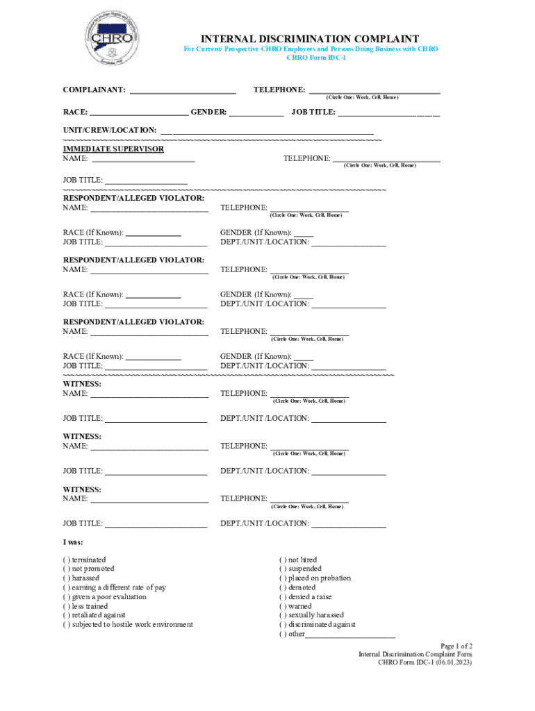 INTERNAL DISCRIMINATION COMPLAINT For Current/ Prospective CHRO Employees and Persons Doing Business with CHRO CHRO Form IDC1COMPLAINANT:TELEPHONE: (Circle One: Work, Cell, Home)RACE:GENDER: ___JOB