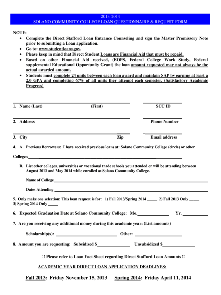 SOLANO COMMUNITY COLLEGE LOAN QUESTIONNAIRE & REQUEST FORM
