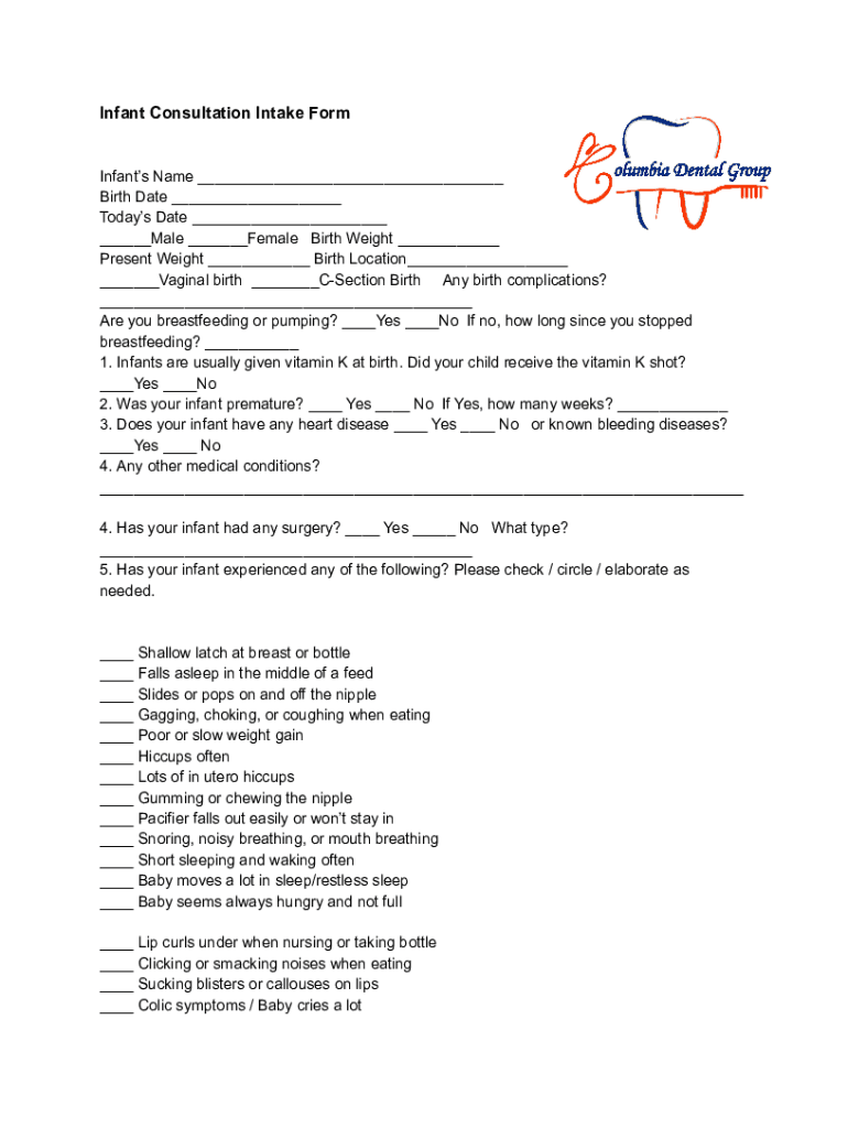 Infant intake forms are documents used by healthcare providers to collect essential information about a newborn or infant, including medical history, family health information, and any immediate care needs.
