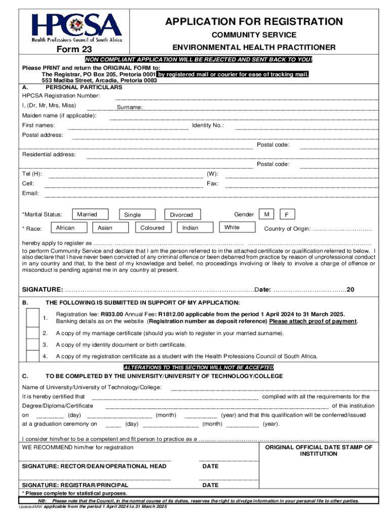 ENVIRONMENTAL HEALTH PRACTITIONERForm 23NON COMPLIANT APPLICATION WILL BE REJECTED AND SENT BACK TO YOU!