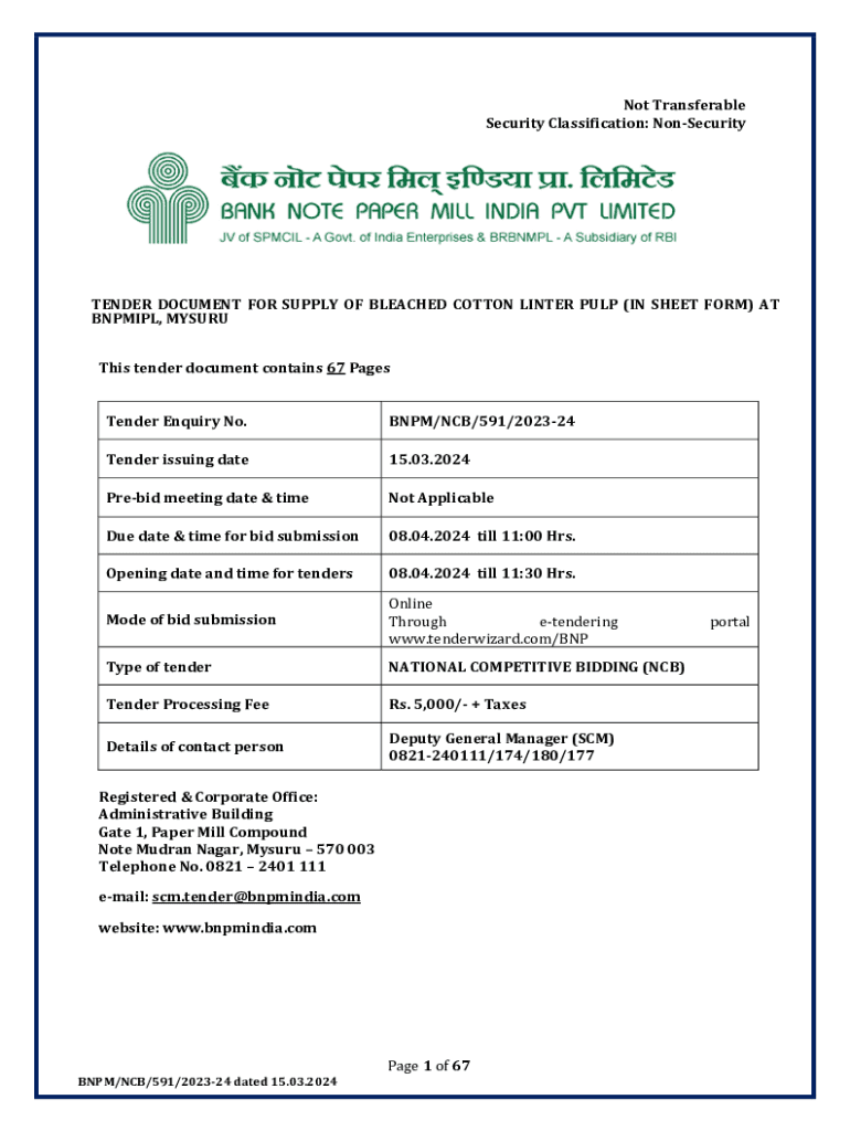 Security Classification: NonSecurityTENDER DOCUMENT FOR SUPPLY OF BLEACHED COTTON LINTER PULP (IN SHEET FORM) AT