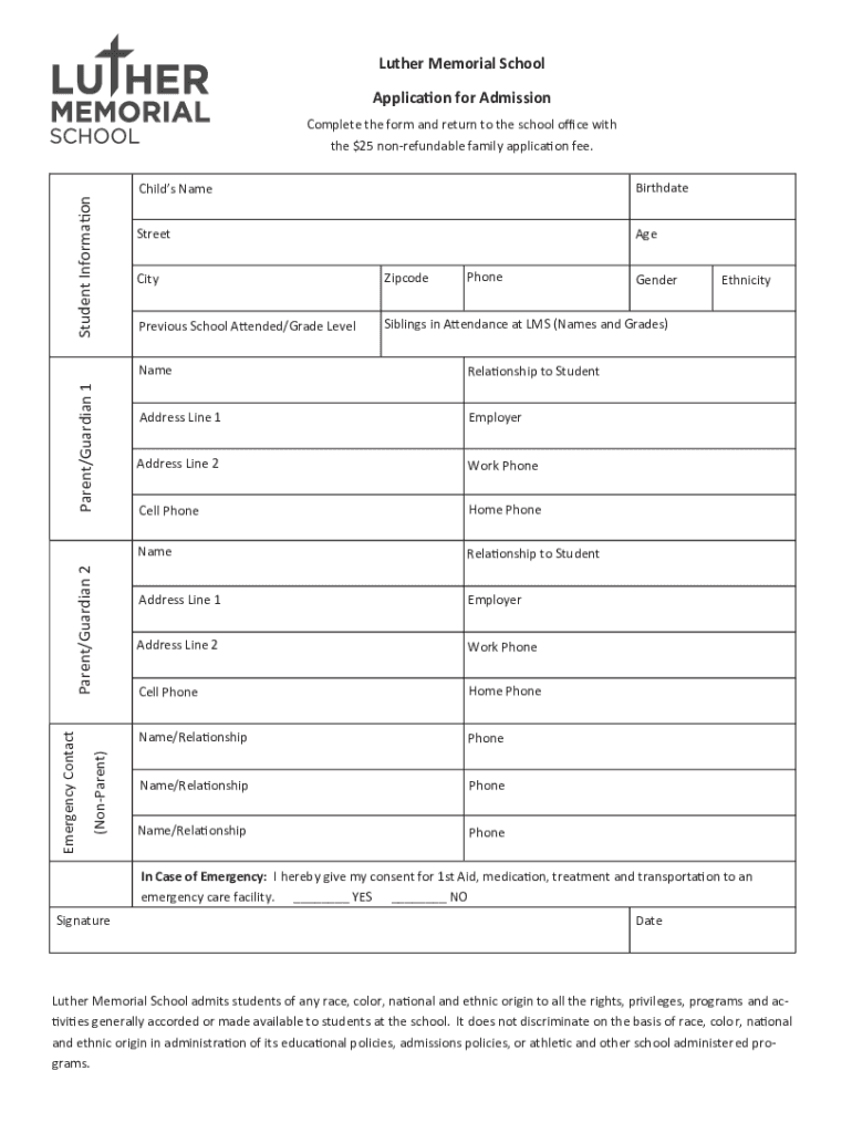 Application for Admission(Godparent)Emergency ContactParent/Guardian 2Parent/Guardian 1Student InformationComplete the form and return to the school one with
