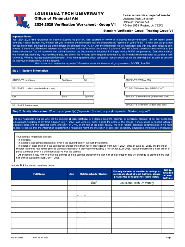 LOUISIANA TECH UNIVERSITYOffice of Financial Aid20242025 Verification Worksheet Group V1Please return this completed form to: