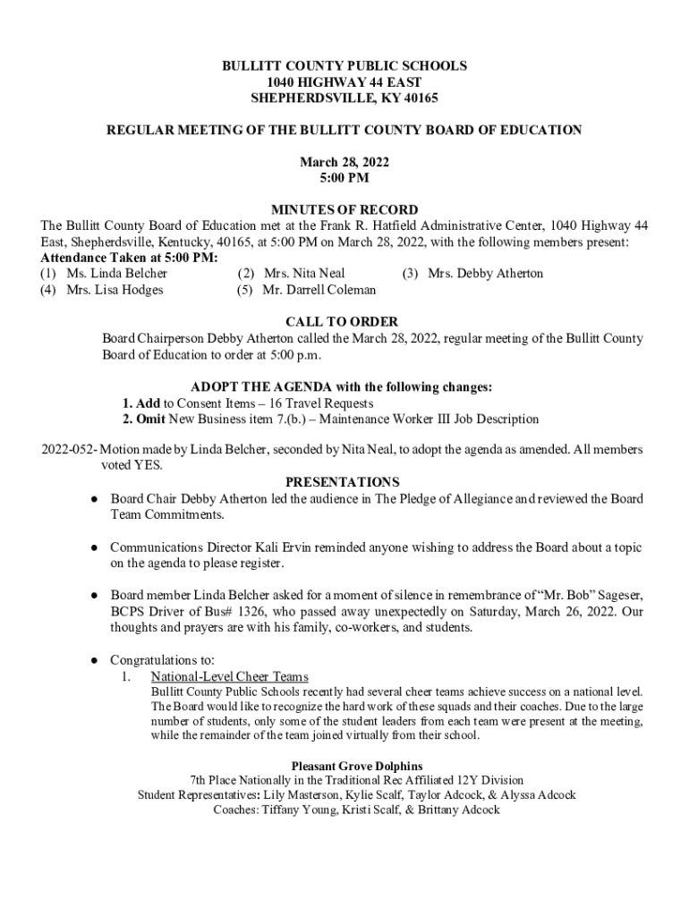 REGULAR MEETING OF THE BULL ITT COUNTY BOARD OF EDUCATION