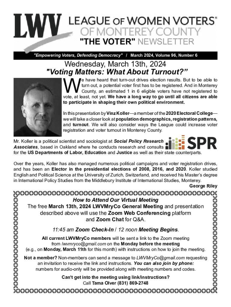 \”THE VOTER\” NEWSLETTER \”Empowering Voters, Defending Democracy\” / March 2024, Volume 96, Number 6Wednesday, March 13th, 2024 \”Voting Matters: What About Turnout? We have heard that