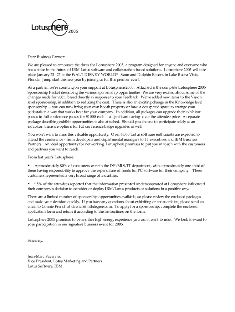 Dear Business Partner: We are pleased to announce the dates for Lotusphere 2005, a program designed for anyone and everyone who has a stake in the future of IBM Lotus software and collaborationbased