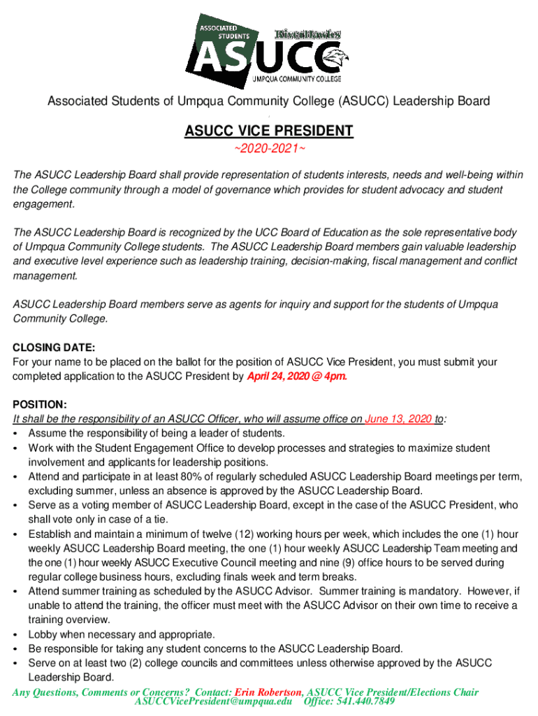. Associated Students of Ump qua Community College (AS UCC) Leadership Board AS UCC VICE PRESIDENT 20202021 The AS UCC Leadership Board shall provide representation of students interests, needs and