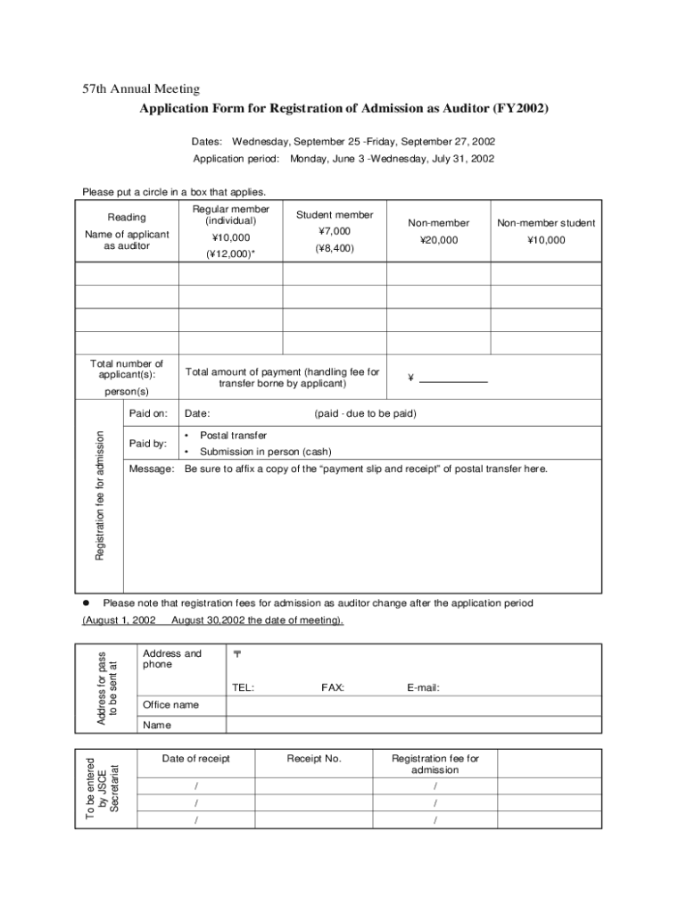57th Annual Meeting Application Form for Registration of Admission as Auditor (FY2002) Dates:Wednesday, September 25 Friday, September 27, 2002Application period:Monday, June 3 Wednesday, July 31,