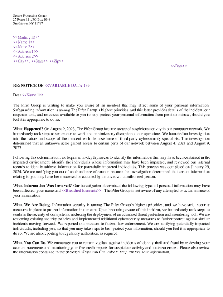 Get the free The Pifer Group, Inc. - Notice of Data Event - MT