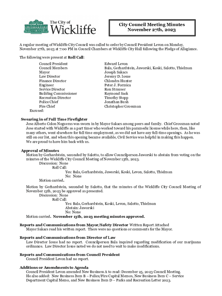 Get the free November 27th, 2023 at 7:00 PM in Council Chambers at Wickliffe City Hall following ...