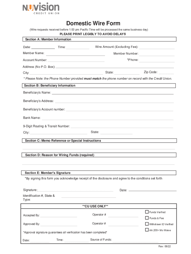 Domestic Wire Form (Wire requests received before 1:00 pm Pacific Time will be processed the same business day)PLEASE PRINT LEGIBLY TO AVOID DELAYS Section A: Member Information Date:Wire Amount (Excluding