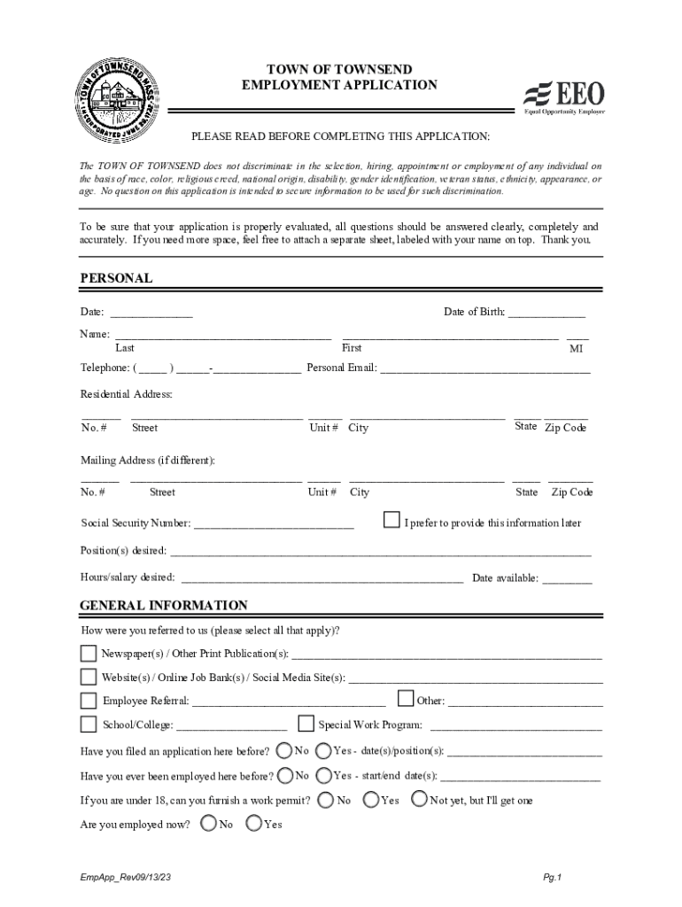 TOWN OF TOWNSEND EMPLOYMENT APPLICATIONPLEASE READ BEFORE COMPLETING THIS APPLICATION: The TOWN OF TOWNSEND does not discriminate in the selection, hiring, appointment or employment of any individual