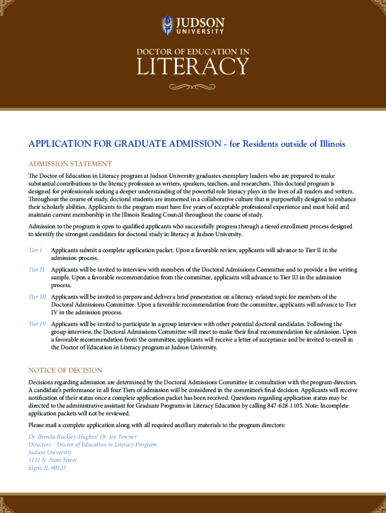 DOCTOR OF EDUCATION INCLITERACY APPLICATION FOR GRADUATE ADMISSION for Residents outside of Illinois ADMISSION STATEMENT The Doctor of Education in Literacy program at Judson University graduates