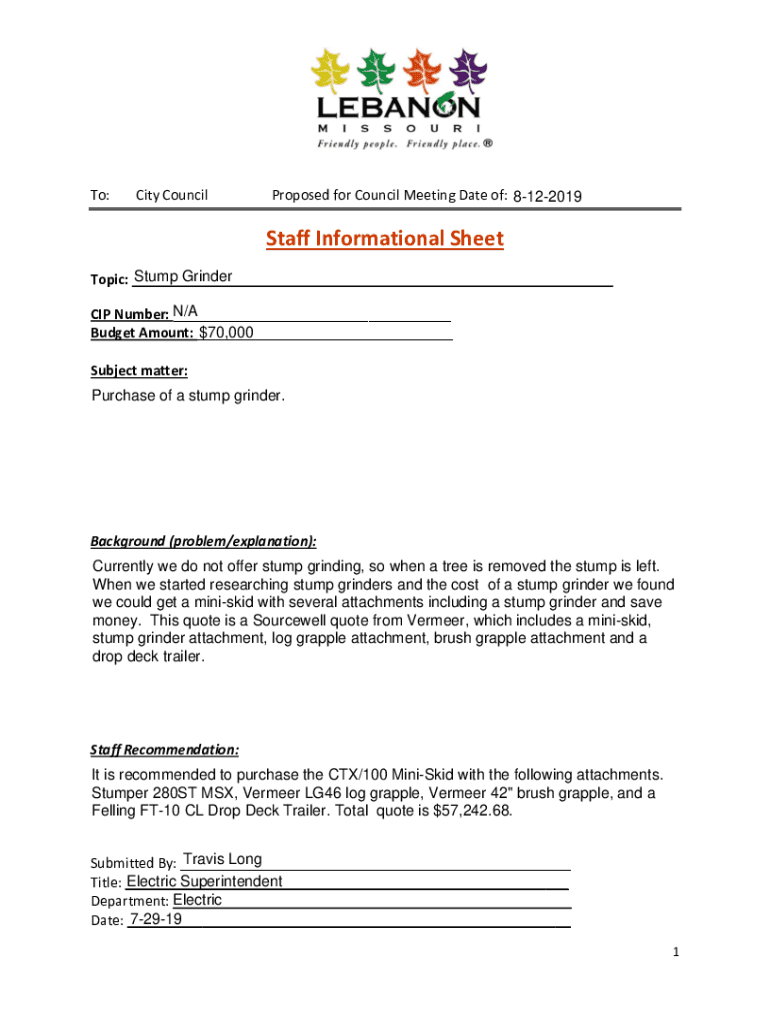 To:City CouncilProposed for Council Meeting Date of: 8122019Staff Informational Sheet Stump Grinder Topic: ___ CIP Number: N/A ___ $70,000 Budget Amount: ___ Subject matter: Purchase of a stump grinder.Background