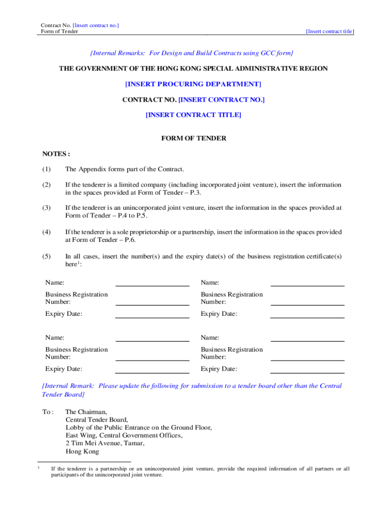 Contract No. [Insert contract no.] Form of Tender[Insert contract title]Internal Remarks: For Design and Build Contracts using GCC form THE GOVERNMENT OF THE HONG KONG SPECIAL ADMINISTRATIVE REGION