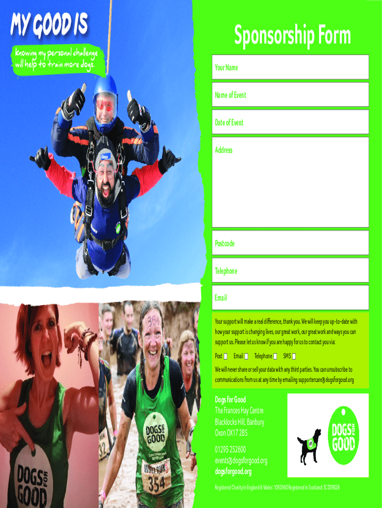 Knowing my personal challenge will help to train more dogs. Sponsorship Form Your Name of Event Date of Event AddressPostcode Telephone Email Your support will make a real difference, thank you. We