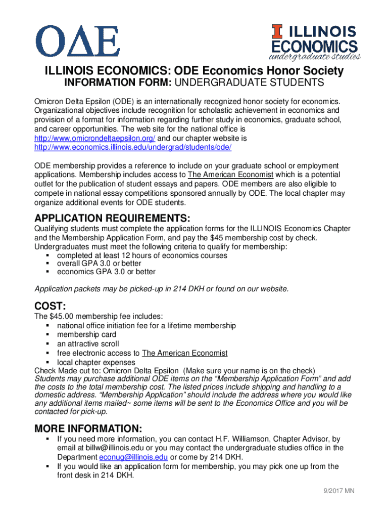 ILLINOIS ECONOMICS: ODE Economics Honor Society INFORMATION FORM: UNDERGRADUATE STUDENTS Omicron Delta Epsilon (ODE) is an internationally recognized honor society for economics. Organizational objectives
