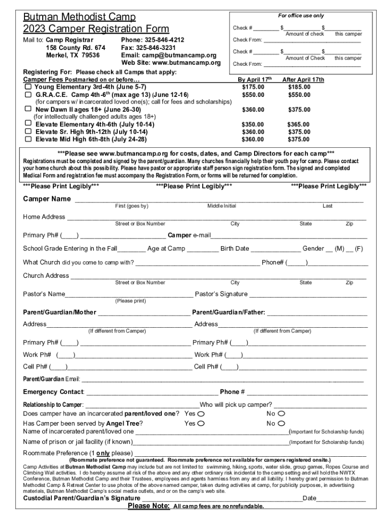 Butman Methodist Camp 2023 Camper Registration FormFor office use only Check # ___ $___ $___ Amount of check this camper Check From: ___Mail to: Camp Registrar 158 County Rd. 674 Merkel, TX 79536Phone: