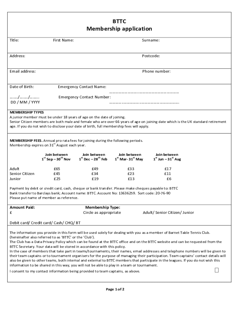 BTTC Membership application Title:First Name:Surname:Address:Postcode:Email address:Phone number:Date of Birth: ../../... DD / MM / YYYYEmergency Contact Name:.. Emergency Contact Number: .....MEMBERSHIP