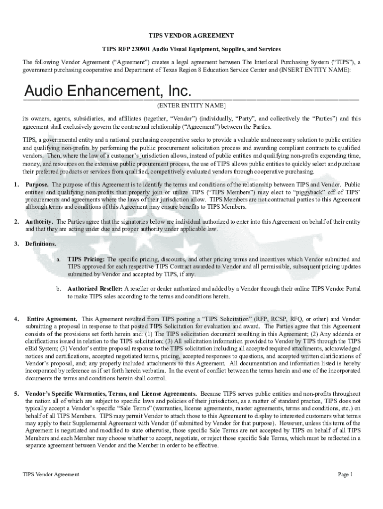 TIPS VENDOR AGREEMENT TIPS RFP 230901 Audio Visual Equipment, Supplies, and Services The following Vendor Agreement (Agreement) creates a legal agreement between The Interlocal Purchasing System (TIPS),