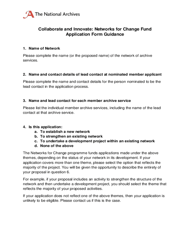 Collaborate and Innovate: Networks for Change Fund Application Form Guidance 1. Name of Network Please complete the name (or the proposed name) of the network of archive services.2. Name and contact