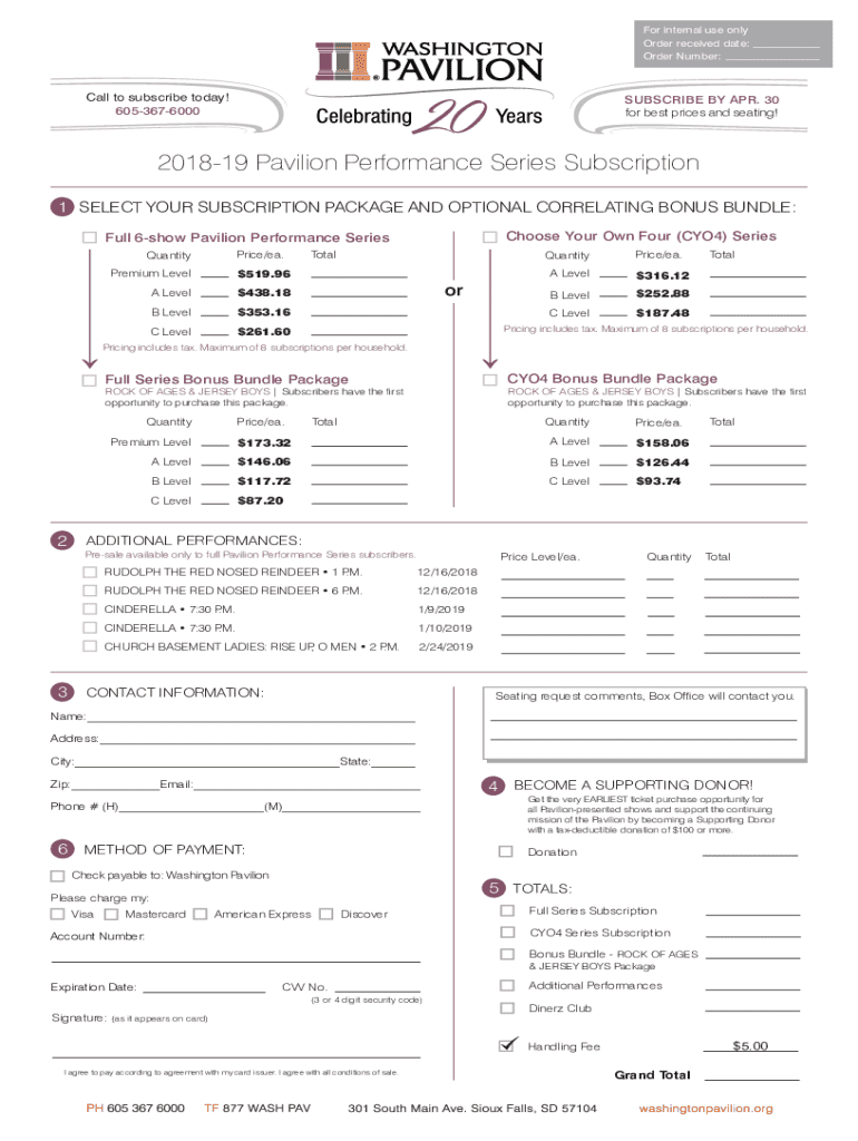 For internal use only Order received date: Order Number:Call to subscribe today! 6053676000SUBSCRIBE BY APR. 30 for best prices and seating!201819 Pavilion Performance Series Subscription 1 SELECT