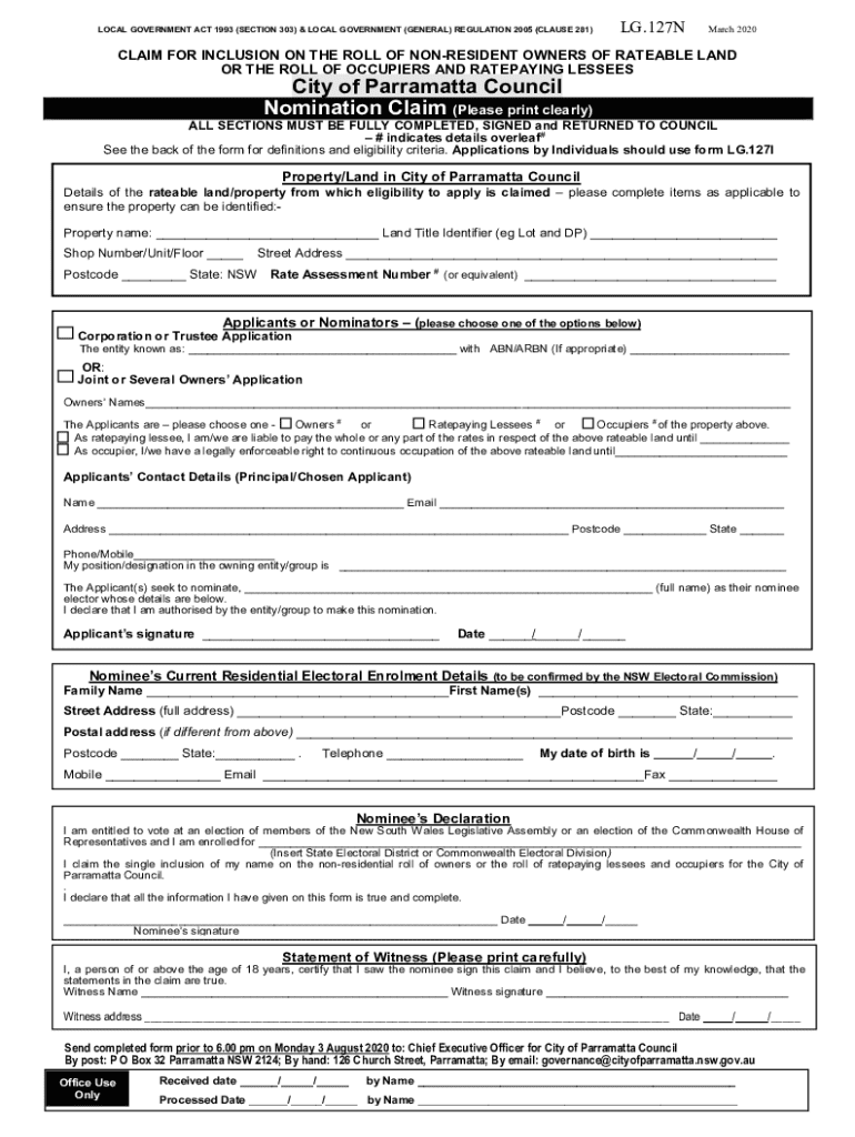 LOCAL GOVERNMENT ACT 1993 (SECTION 303) & LOCAL GOVERNMENT (GENERAL) REGULATION 2005 (CLAUSE 281)LG.127NMarch 2020CLAIM FOR INCLUSION ON THE ROLL OF NONRESIDENT OWNERS OF HATEABLE LAND