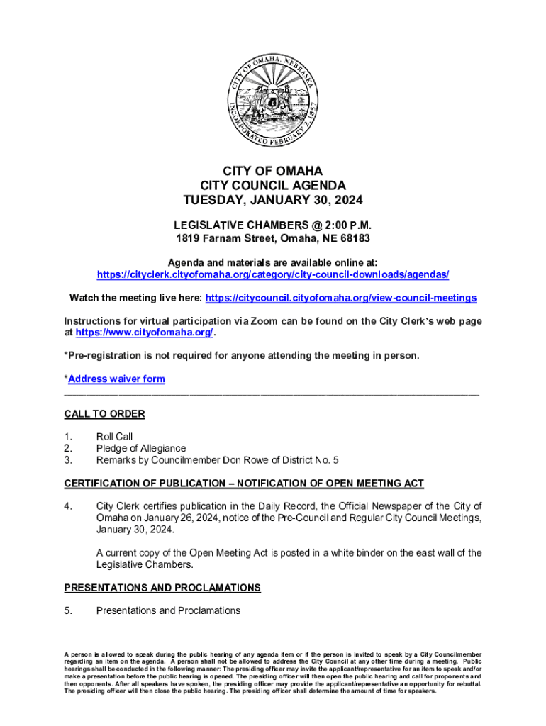 CITY OF OMAHA CITY COUNCIL AGENDA TUESDAY, JANUARY 30, 2024 LEGISLATIVE CHAMBERS @ 2:00 P.M. 1819 Farnam Street, Omaha, NE 68183 Agenda and materials are available online at: https://cityclerk.cityofomaha.org/category/citycouncildownloads/agendas/